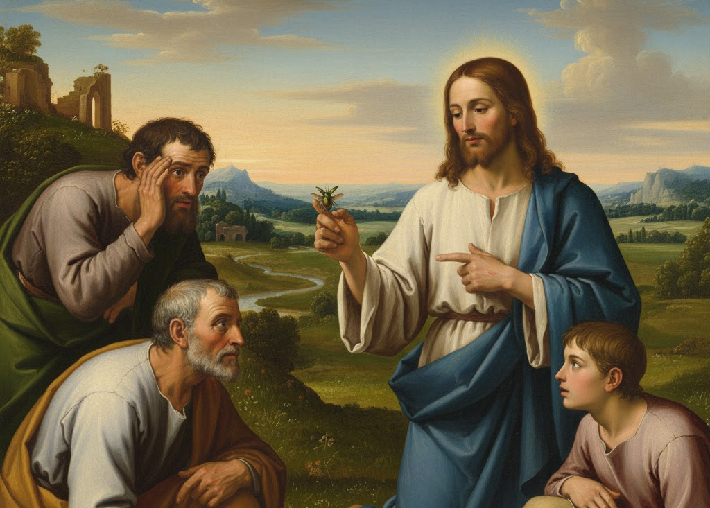 다른 사도들이 선생님께 다가와 식물계와 동물계에서 끌어낸 교훈을 듣고 있다.