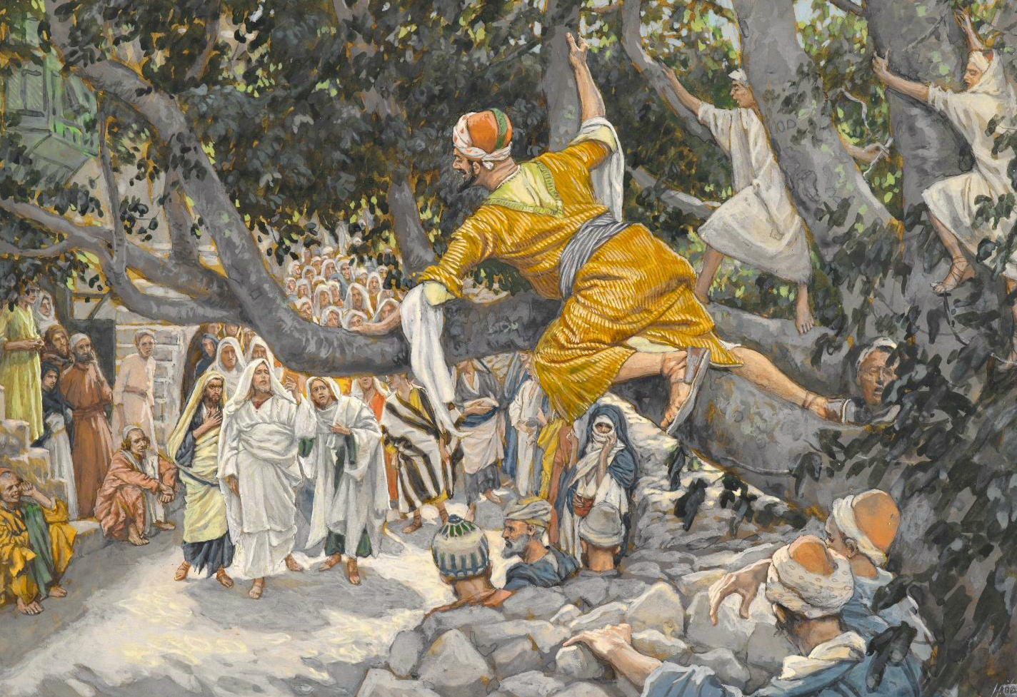그러자 자캐오는 겉옷을 벗고 짧은 튜닉만을 입은 채로 한 나무 위로 올라간다. 그는 짧은 팔다리로 어렵게 크고 미끄러운 나무줄기를 타고 올라간다. 그러나 그는 마침내 성공하여 홰에 올라앉듯이 두 개의 가지에 걸터앉는다. 그의 두 다리는 일종의 난간과도 같은 그 나뭇가지 아래로 늘어져 있고, 마치 창가에서 밖을 내다보기라도 하는 것처럼 그는 상반신을 가지에 기대고 있다.