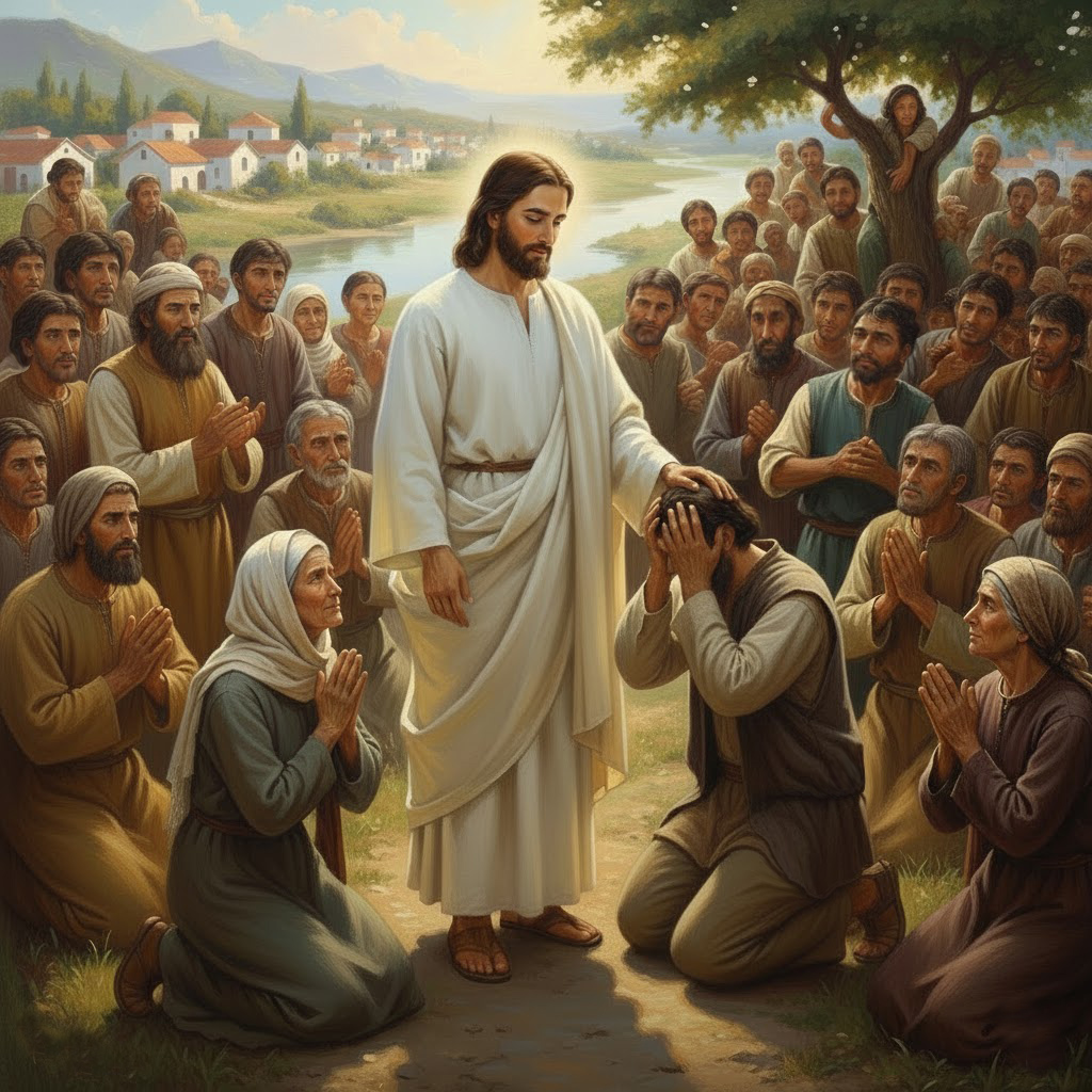 예수께서는 초자연적인 공포로 정신이 혼미한 그 불쌍한 사람의 헝클어진 머리에 양손을 얹고 말씀하신다.