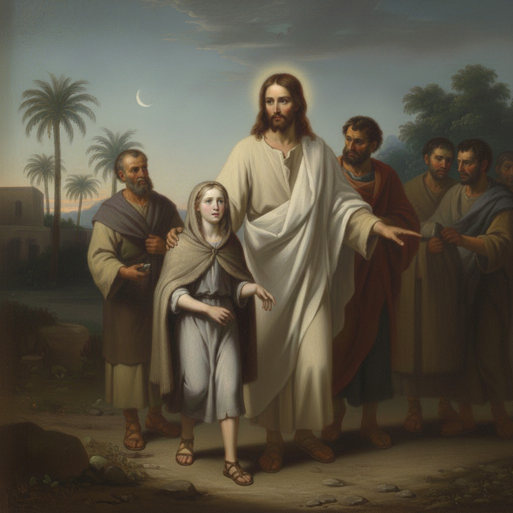 예수께서는 소녀의 머리에 손을 얹으시며 말씀하신다. 소녀는 자세를 바꾸어 무릎을 꿇으며 말한다.