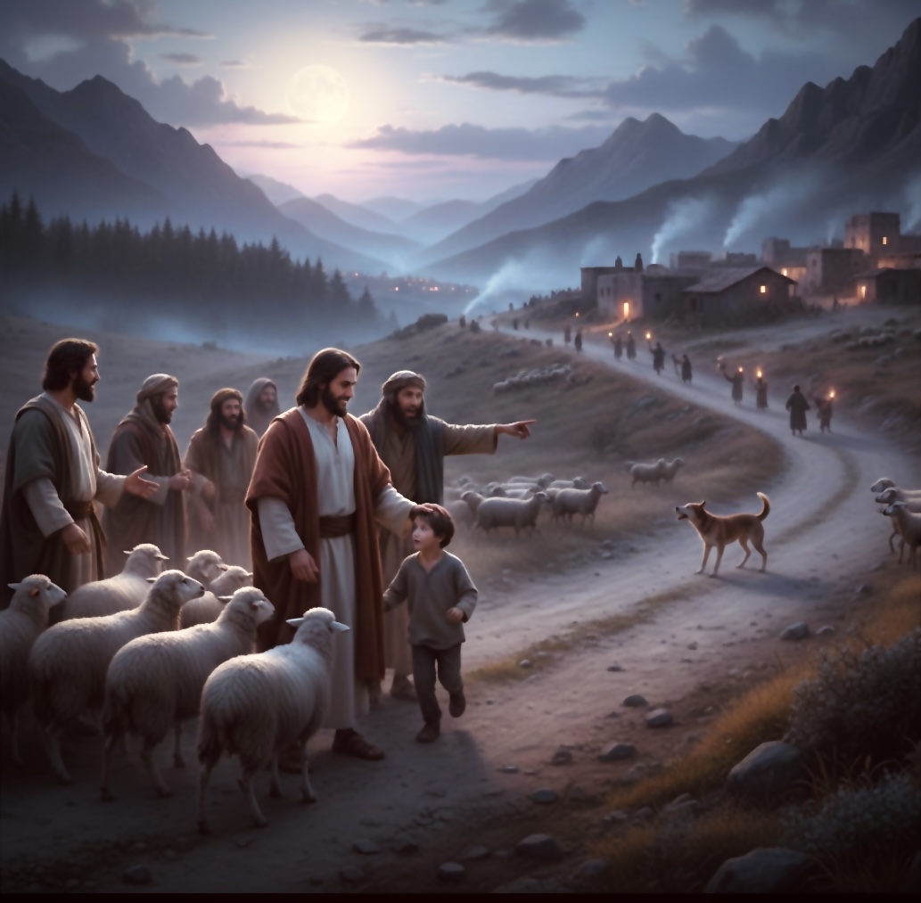 그들은 지금 큰 길 위, 양 옆에는 산기슭, 일렬로 나아가고 있는 양떼 뒤, 목자의 갈고리와 감시견 사이에 끼어 있다. 지금은 소년이 예수 곁에 있게 되어 그분께서는 그를 쓰다듬어주신다.